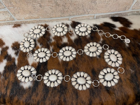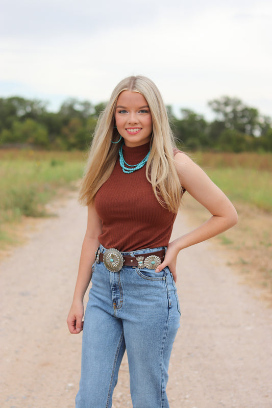 Brown Leather Oval Concho Ribbon Turquoise Stone Belt