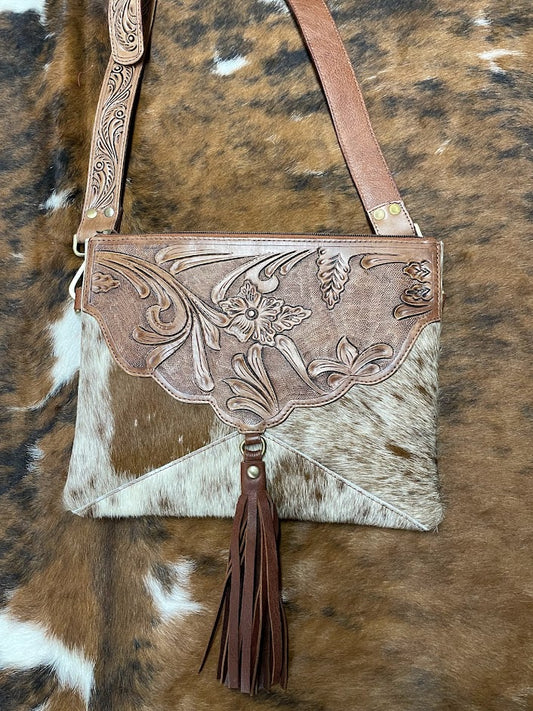 Tooled Leather Western Cowhide Crossbody With Buckle