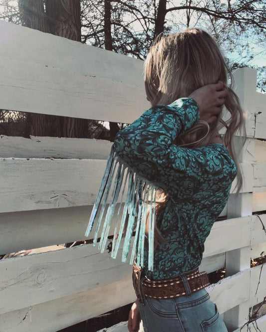 Turquoise Tooled One Shoulder Fringe Bodysuit