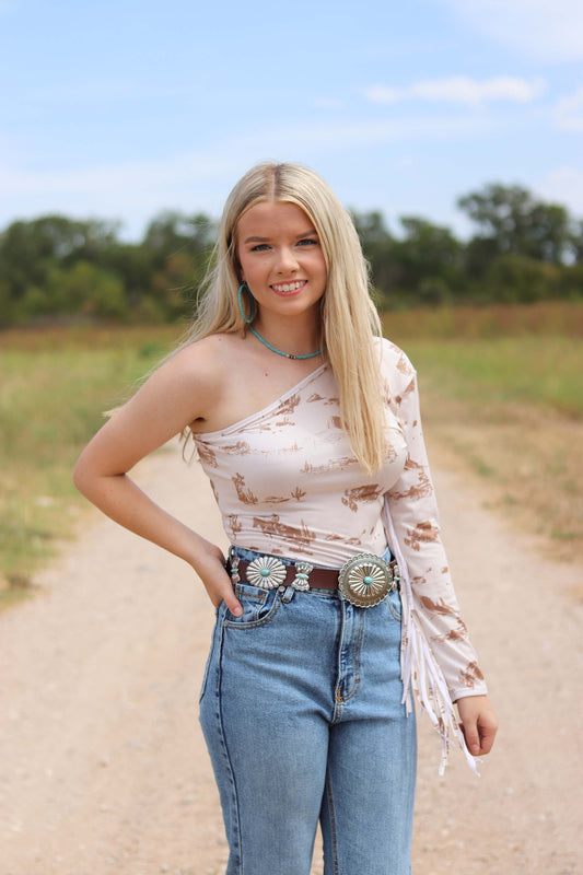 Cream Desert Cowboy One Shoulder Fringe Bodysuit