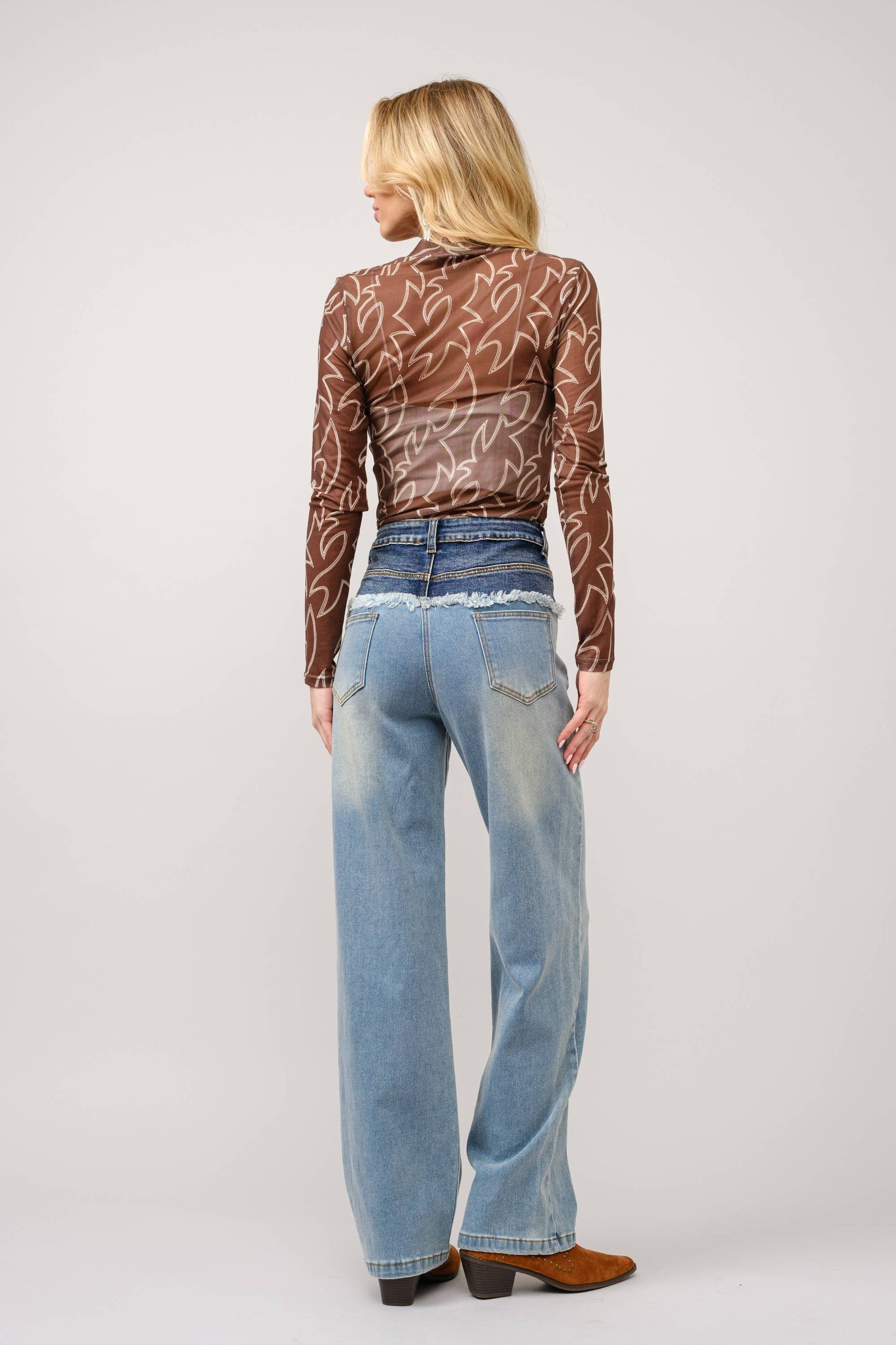 This fitted top features boots stitch detailing throughout and a mesh mock neck, offering a sleek and stylish silhouette.