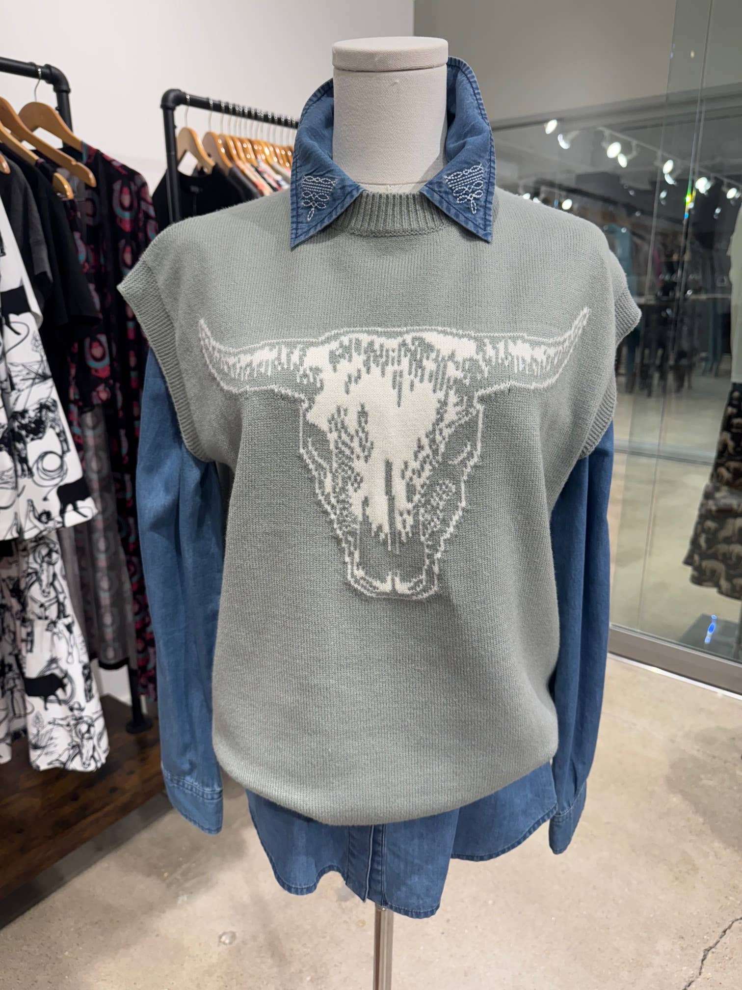 Soft knit pullover sleeveless sweater that can be worn as a top or layered as a vest as shown here. Long sleeve shirt is sold separately.